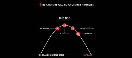 这将带来顶部阶段。这一时期的特点是放纵,表现为高负债,财富、价值观差距和政治鸿沟巨大,教育和基础设施的质量下降,国家内部不同群体的民众之间存在冲突,由于扩张过度的帝国受到新兴竞争对手的挑战,国家之间发生争斗。