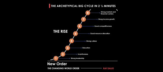 上升阶段。上升阶段是国家建设的繁荣时期,通常在一个新秩序建立之后到来,而新秩序通常出现在战争之后。在这一阶段,国家根基强大,因为债务水平相对较低,国民的财富差距、价值观差距和政治鸿沟相对较小,人们有效地合作,创造繁荣。教育和基础设施良好。领导者强大而有能力。世界秩序和平有序,由一个或多个主导性的世界大国引导。