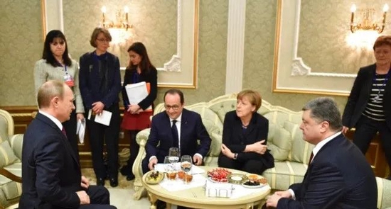 ▲ 2015年2月11日,俄、法、德、乌四国领导人在白俄罗斯明斯克会谈