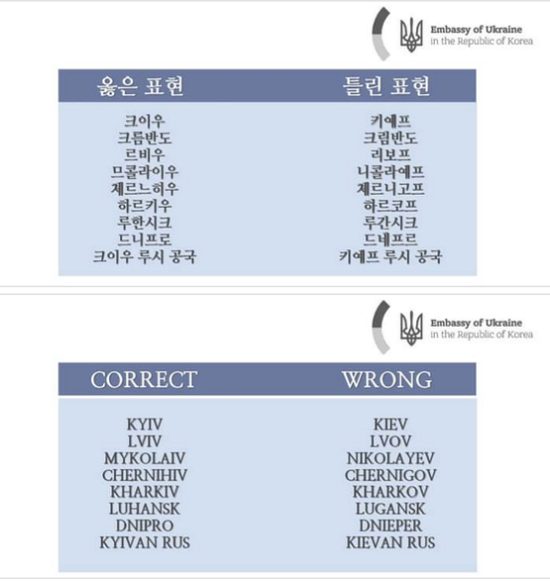 随后乌驻韩使馆话锋一转称:这就是为什么,我们呼吁韩国公众和政府停止用俄语发音去翻译乌克兰地名,请不要 “用‘占领’我们城市的人的叫法,这是在冒犯我们。”在文末,乌驻韩使馆还表示,如果想知道乌克兰语的正确拼写,请咨询我们,并列出乌驻韩使馆认为地乌克兰地名“正确”和“错误”拼写。
