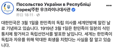 乌克兰驻韩使馆在文中称:“3月1日是韩国独立运动纪念日,纪念韩国1919年3月1日反抗日本殖民统治发表独立宣言的日子……而乌克兰人也正在对抗“俄罗斯占领军。”