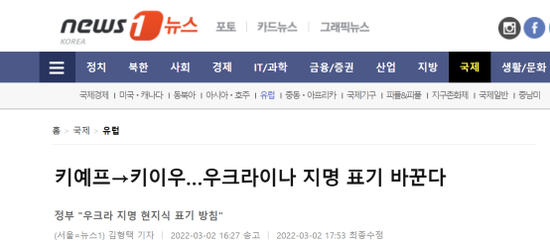 “news1”新闻网:키예프(俄语发音的基辅)→키이우(乌克兰语发音的基辅)…改变乌克兰地名标记