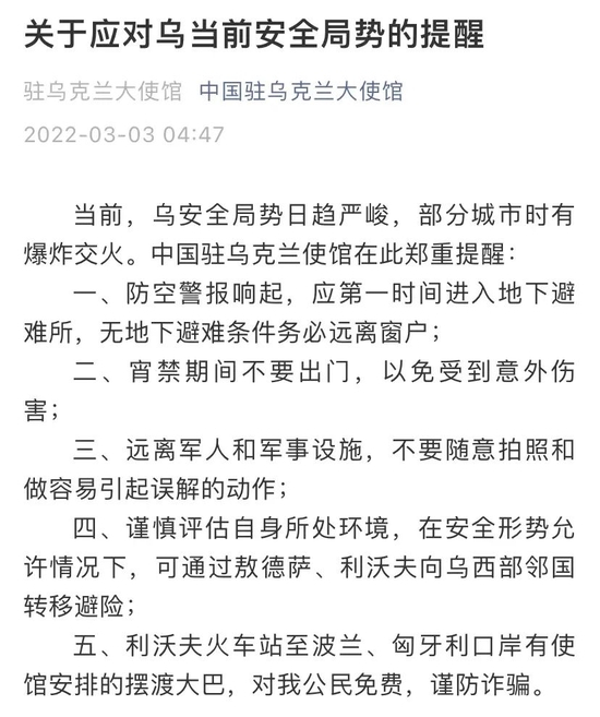 3月3日,中国驻乌克兰大使馆发布提醒表示,当前,乌安全局势日趋严峻,部分城市时有爆炸交火,在乌中国公民要远离军人和军事设施,不要随意拍照和做容易引起误解的动作。