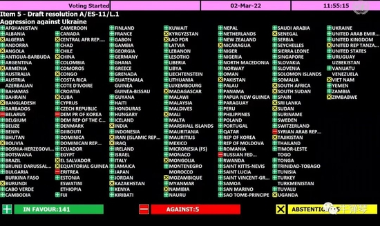 事情,大家也都知道了。联合国大会紧急会议,以141票赞成、5票反对,35票弃权,通过了涉乌克兰局势决议草案,谴责俄罗斯进攻乌克兰,要求俄罗斯“立即、彻底、无条件”从乌克兰撤军,此外,还有针对白俄罗斯的相关条文。