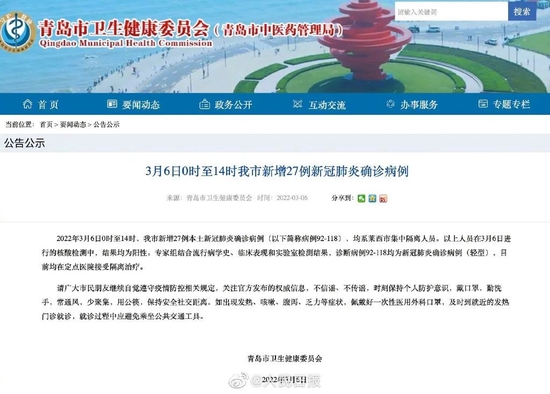 据青岛市卫健委最新消息,3月6日0时至14时,山东青岛市新增27例本土新冠肺炎确诊病例(以下简称病例92-118),均系莱西市集中隔离人员。以上人员在3月6日进行的核酸检测中,结果均为阳性。专家组结合流行病学史、临床表现和实验室检测结果,诊断病例92-118均为新冠肺炎确诊病例(轻型),目前均在定点医院接受隔离治疗。