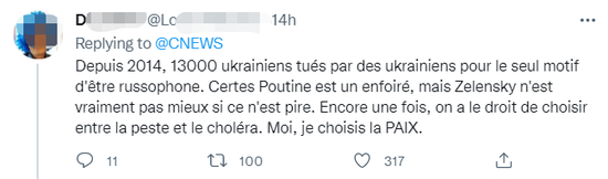 “自2014年以来,有13000名乌克兰人‘因说俄语’而被乌克兰当局杀害。当然,普京不是好人,但泽连斯基只会更糟。等于我们再一次在瘟疫和霍乱之前做选择。我选择和平。”