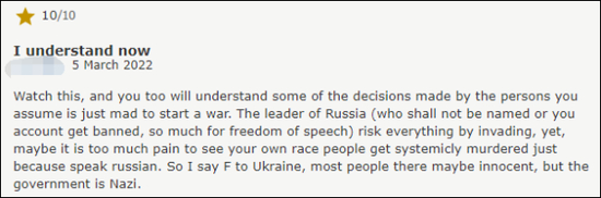 有用户写道:“看看这个,你会理解那些被你假设为‘疯狂发动战争’的人做出的决定。俄罗斯的领导人(不能写下姓名,否则你的账户会被封,这就是为了所谓的言论自由)冒着一切风险进攻(乌克兰),然而,也许是他太痛苦了,因为看到自己的民族仅仅因为说俄语就被系统性地屠杀。所以我对乌克兰说F,那里的大多数人可能是无辜的,但政府是纳粹。”