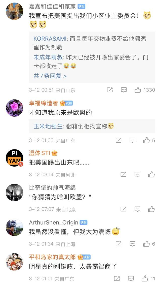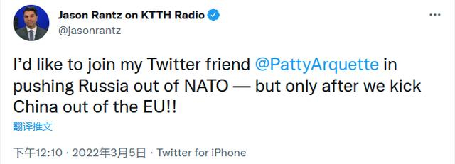 美国保守派电台KTTH主持人杰森·兰茨(Jason Rantz)就此事也发了一条画风清奇的推文,“把俄罗斯踢出北约前,得先把中国踢出欧盟!”,一语再掀波澜。不过很多人认为杰森此举是在反讽,毕竟作为特朗普“铁粉”的他和反对特朗普的阿奎特本就不对付。