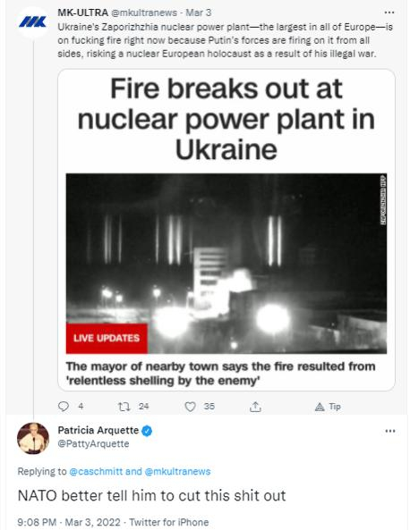 就在事发前一天,3月3日,阿奎特又转发了这家自媒体声称“俄军正对乌克兰核电站开火”的消息,然后评论道“北约最好告诉他(俄罗斯)别再闹了”。