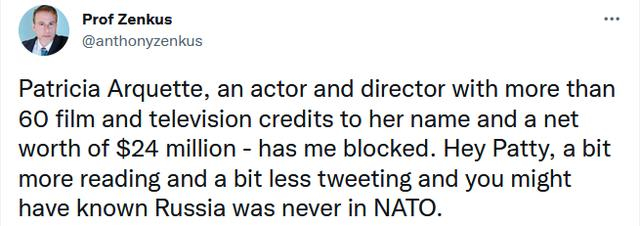 “这是自这场冲突开始以来我读过的最愚蠢的发言,帕特里夏·阿奎特想把俄罗斯踢出北约。你是真的站在纳粹一边,还是你根本不知道你在说什么?”