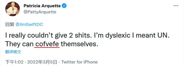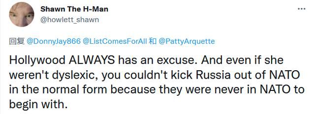 最近,她转发了一则声称“俄军在乌克兰核电站设置炸药以威胁整个欧洲”的自媒体消息,更气愤难耐地提议“把俄罗斯踢出北约”(Kick Russia out of NATO)。然而俄罗斯根本不是北约成员国,更何况此次俄乌冲突升级本就是以美国为首的北约5次东扩主要引起的,阿奎特因此遭到网友群嘲。事后她以自己患有“阅读障碍症”为由开脱,称自己的本意是想写“联合国”(UN),但错写成了“北约”(NATO)。