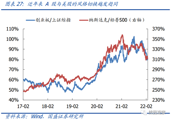 近年来,随着国内金融市场开放以及A股外资占比持续提升,A股与美股走势越发趋同,并且A股与美股的风格切换也基本同步,表现为创业板/上证综指与纳斯达克/标普500的走势高度一致。近期上证综指持续下跌、同时创业板明显跑输主板,与美股风格表现完全一致。因此,美联储加息影响美股走势和风格,也会对A股产生传导效果。
