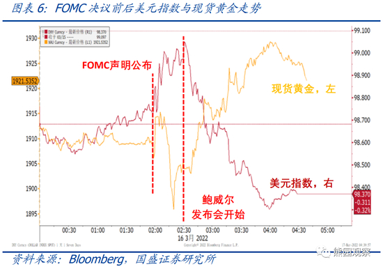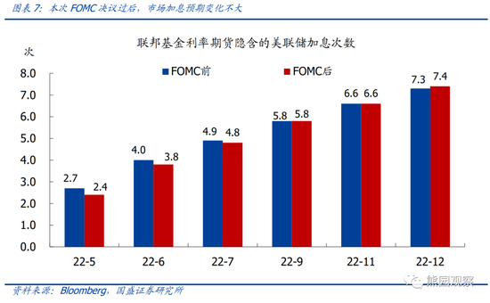3.资产价格与加息预期变化:本次会议并未超预期鹰派,会议过后,美股和黄金先跌后涨,美债收益率和美元指数先涨后跌,利率期货隐含的加息次数变化不大。