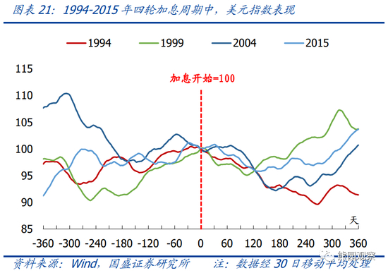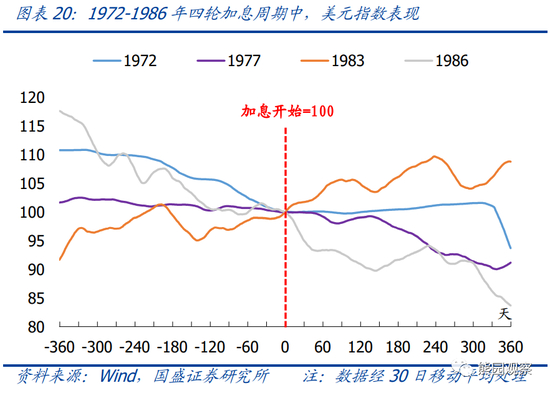 >美元:历轮加息周期开始后,美元指数在4-6个月内普遍下跌,6个月后大多重新开始上涨。