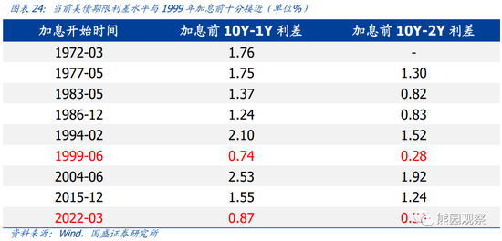 美债期限利差可以对经济衰退进行预测,历史上美债期限利差倒挂后,平均两年内就会发生衰退。由图表24可见,本轮加息开始前,美债10Y-1Y利差、10Y-2Y利差均与1999年加息前十分接近。作为参照,1999年的加息周期中美联储共加息6次、累计175bp(包括一次50bp)、持续11个月。