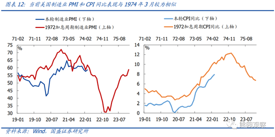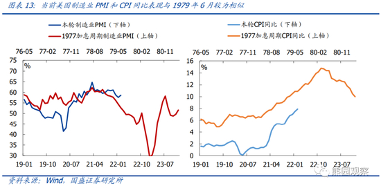 若不以加息起始点作为对比节点,而是将范围扩大到整个加息周期,通过对美国制造业PMI和CPI同比的走势与绝对值进行对比,我们发现当前的宏观环境与1974年3月和1979年6月较为相似,即都表现为:PMI已开始回落但绝对值仍高,CPI快速走高但从数个月后开始持续回落,且绝对值也较为接近,详见图表12和13。但除开PMI和CPI表现来看,当前与这两个时期有两大明显的不同之处:
