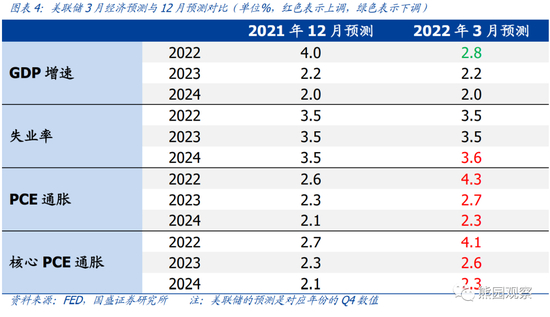 >经济预测变化:本次经济预测与去年12月相比,将2022年底的GDP增速预测由4.0%大幅下调至2.8%,未来两年保持不变;近两年的失业率预测保持不变,2024年由3.5%小幅上调至3.6%;将2022年底的PCE通胀由2.6%大幅上调至4.3%,核心PCE通胀由2.7%大幅上调至4.1%,未来两年也有小幅上调。