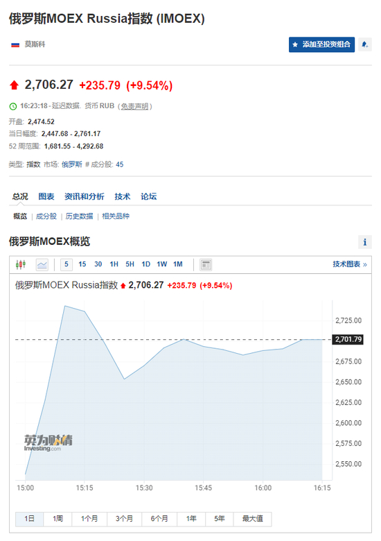 开盘后,MOEX俄罗斯指数迅速拉升。截至发稿,该指数已涨超10%。