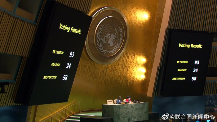 当地时间4月7日,联合国大会有关乌克兰问题的紧急特别会议继续召开,大会投票决定暂停俄罗斯在联合国人权理事会的成员资格。投票结果为,93票赞成,24票反对,58票弃权,弃权的成员被认为没有参加表决。因超过2/3的成员投票赞成,旨在暂停俄罗斯人权理事会成员资格的决议草案获得通过。