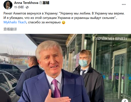 2月23日,阿克梅托夫回到基辅,在采访中捂着胸口说:“我们爱乌克兰。我相信乌克兰和乌克兰人会从这种困境中走出来。”