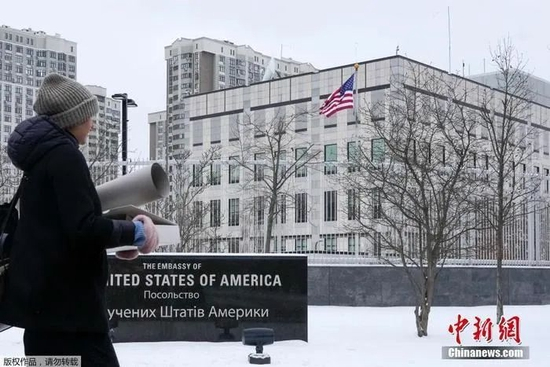 资料图:2022年1月24日,乌克兰基辅,一名女子路过美国驻乌克兰大使馆。