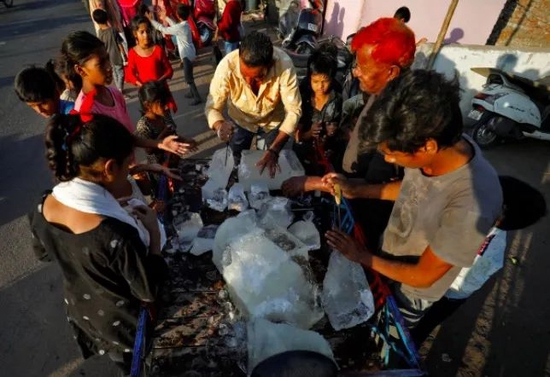当地时间2022年4月28日,印度艾哈迈达巴德,一男子向贫民窟居民分发冰块 图源:外媒