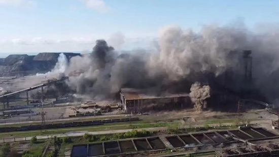 当地时间2022年5月5日,顿涅茨克马里乌波尔,亚速钢铁厂浓烟四起图片来源:视频截图