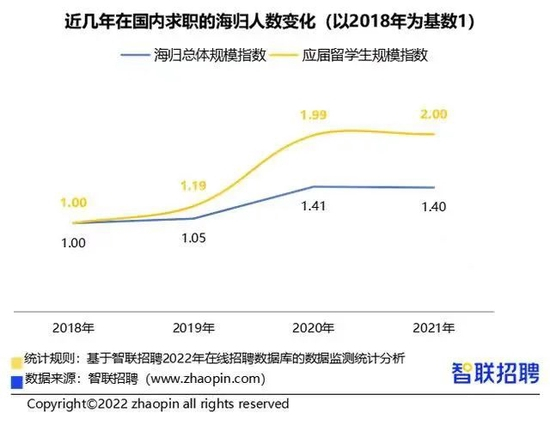 据智联招聘《2021中国海归就业调查报告》,2020年全年在国内求职的留学生总人数同比增长33.9%,其中应届留学生人数增幅达67.3%。2021年在国内求职的留学生总人数及应届留学生人数与2020年基本持平。