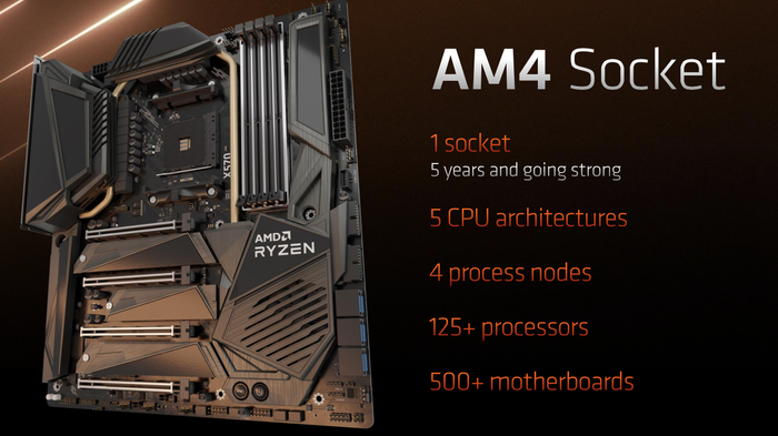 在发布会上,AMD 回顾了 AM4 平台,称该平台现已沿用 5 年,经历了 5 代 CPU 架构、4 种不同工艺、超 125 款款处理器,该平台主板型号超过了 500 种。