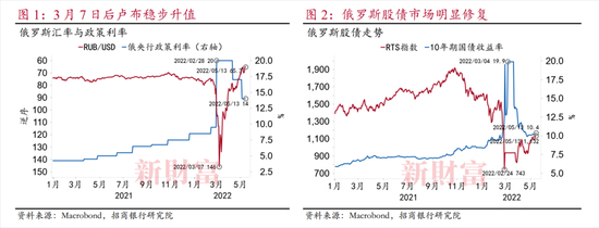 俄罗斯的反制裁措施,短期内取得了一定的效果。汇率方面,卢布汇价在3月7日达到最低点146,此后逐步升值至65.3,目前已经回到冲突前水平之上(图1);关键政策利率提高到20%后,再下调至14%,显示恐慌式的资金外逃有所缓解;股市方面,2月24日俄罗斯RTS指数恐慌下跌至743点的低点,5月中反弹至1132点;债市方面,3月4日俄罗斯10年期国债收益率升至19.9%的高点,此后快速回落至10.4%左右(图2)。目前,西方制裁还在不断演变升级,对俄实体经济的影响不可小觑,预计今年俄罗斯经济总量将收缩12%至16.5%。