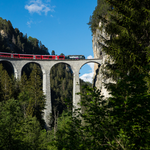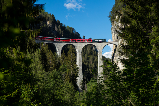 一列火车行驶在瑞士阿尔布拉-贝尔尼纳铁路线的高架桥上。郑焕松摄(新华社)