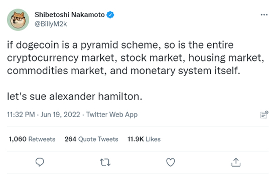 对于约翰逊对马斯克的指控,狗狗币创始人Shibetoshi Nakamoto于当地时间6月20日也进行了反驳。他写道:如果狗狗币是金字塔计划,那么整个加密货币市场、股票市场,商品市场和货币体系本身也是如此。让我们起诉亚历山大 汉密尔顿(美国金融体系的创始人和首席设计师)。