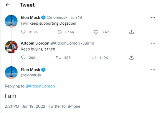 此后,马斯克便利用其影响力频频在推特上给狗狗币造势推广。在大多数时候,马斯克发言后,狗狗币价格都会出现波动,两者呈现较为明显的联动效应。2021年4月,马斯克在推特上甚至称他将通过SpaceX飞船将“狗狗币(Dogecoin)”这几个字送上月球,这直接推动狗狗币涨至67美分的历史新高。