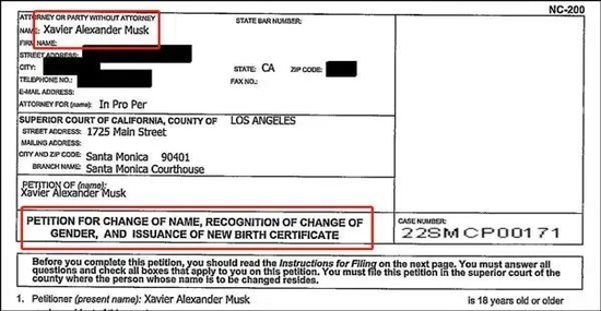 泽维尔·亚历山大·马斯克向法院申请更改姓名、性别及出生证明。图自美国法庭公开文件网站 PlainSite.org