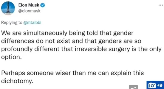 6月11日,马斯克发布了一条动态写道:“我们不断被灌输性别不存在差异的观念,但事实上性别差异如此之大,要实现没有差异只能通过不可逆的手术实现。”