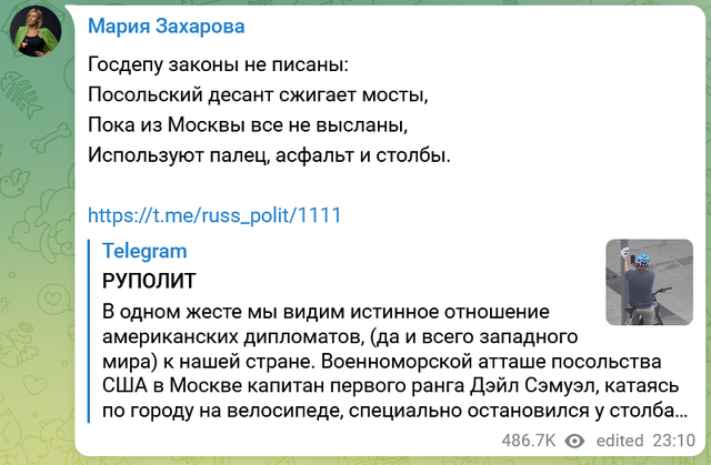 对于文末关于“政府应如何就塞缪尔的行为作出回应”的提问,扎哈罗娃写了一首小诗:“俄联邦没有制定法律:大使馆伞兵用手指、沥青和柱子,正在烧毁桥梁,直到所有人都被驱逐出莫斯科。”