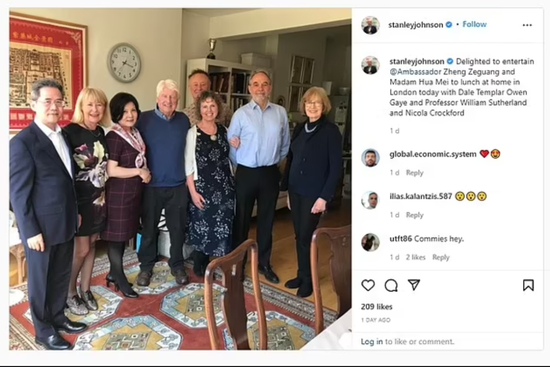 今年4月,老约翰逊在自己的ins账号上透露,他曾在伦敦招待了中国驻英大使夫妇共进午餐,他说自己“很高兴”招待两位客人。
