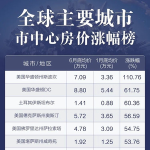 值得一提的是,瑞士苏黎世市中心今年上半年房价大涨逾24%,均价升至11.68万元,超过伦敦,登上欧洲城市房价之巅。尽管有汇率回落的拖累,欧洲主要大城市今年上半年房价整体依然出现较好涨幅。德国法兰克福市中心房价上半年涨超20%,荷兰阿姆斯特丹、德国柏林、奥地利维也纳等市中心房价上半年均涨超10%。
