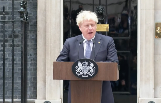 当地时间7月7日中午,英国首相鲍里斯·约翰逊在唐宁街10号院外发表讲话,宣布辞去首相一职,而选择新首相的时间表将于下周公布。他还表示,在找到接班人前继续履行首相职务,并已经任命多名新部长。在约翰逊宣布辞职后,英国外长特拉斯随即在社交媒体上发文:“首相做出了正确的决定。”