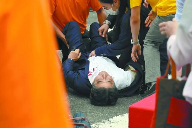 安倍在奈良街头遭枪击后倒地,胸部出血。