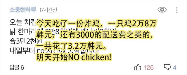 有网民介绍,自己昨天刚点了一份炸鸡,花了3.2万韩元(约合人民币163元),“从明天开始,无炸鸡!”