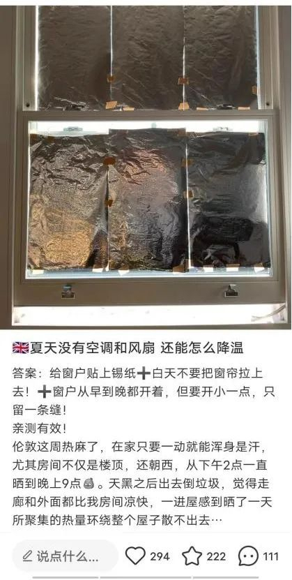 ▲有英国留学生自测窗户贴满锡纸降温 来源:社交媒体截图
