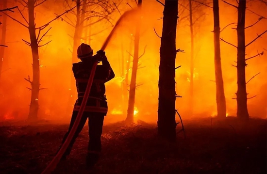 当地时间2022年7月18日,法国吉伦特省,一名消防员在拉泰斯特德比什地区的森林火灾现场浇水救火,法国紧急出动了更多的洒水机和数百名消防员来扑灭蔓延的野火