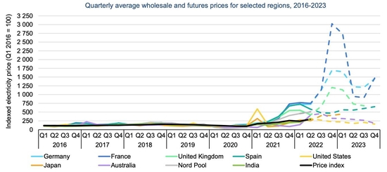 2016-2023年部分地区的季度平均电力批发和期货价格指数,2016年Q1=100。国际能源署《电力市场报告》(2022年7月更新)