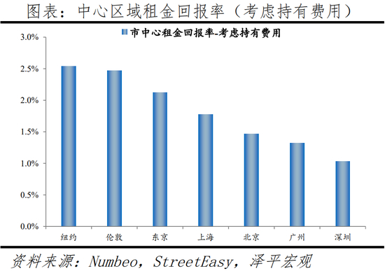 国际核心城市普遍征收房地产税、且物业费等较高,持有成本明显高于中国内地。在不考虑房地产税从个人收入所得税中扣除情况下,纽约市房地产税率为0.8%,市中心物业费约为104元/平方米/月,外围区物业费约为80元/平方米/月;除此之外,业主还需根据房产面积和档次的不同,每年缴纳1000-5000美元的房屋保险费。伦敦业主需要缴纳市政税,约占房价的0.3%-1.2%,实际税率随房价上升而下降,伦敦市中心物业费约为44元/平方米/月,外围区物业费约为23元/平方米/月。东京业主每年需要缴纳房屋评估价1.4%的不动产税和0.3%的市政建设税,房屋评估价约为售价的20%,市中心和外围物业费分别为22元/平方米/月、13元/平方米/月。中国内地除上海和重庆作为试点外尚未推出房地产税,而且物业费较低,北京、上海、深圳市中心的物业费约为4.3元/平方米/月,外围区物业费约为3.5元/平方米/月,广州市中心物业费为2.9元/平方米/月,外围区物业费为2.4元/平方米/月。
