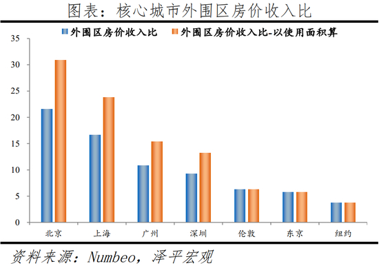 以使用面积算,北上广深市中心房价收入比分别为54、45、35、32,高于纽约的7,东京的9,伦敦的14;外围区房价收入比均在10以上,同样高于纽约、伦敦和东京。Numbeo只公布了全市房价收入比,我们采用Numbeo公布的房价平均数据和人均可支配收入,以及我们整理的人均住房面积计算市中心和外围区的房价收入比。根据Numbeo,2022年5月,北京、上海、广州、深圳市中心的房价收入比分别为38、32、24、22,外围区的房价收入比分别为22、17、11、9,而纽约市中心和外围区房价收入比分别为7、4,伦敦市中心和外围区房价收入比分别为14、6,东京市中心和外围区房价收入比分别为9、6。换算为使用面积后,中国内地一线城市实际房价收入比更高,北京、上海、广州、深圳市中心的房价收入比分别为54、45、35、32,外围区的房价收入比分别为31、24、15、13。