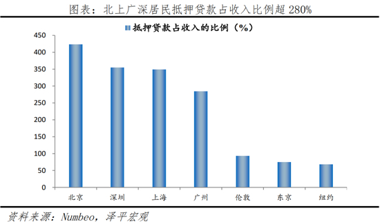 北上广深居民房贷压力居世界前列,居民抵押贷款占收入比例超280%,是纽约、伦敦、东京的3-4倍。根据Numbeo定义,抵押贷款占收入比例指每月抵押贷款与家庭收入的比率(越低越好),贷款负担能力指数指抵押贷款占收入比例的倒数(越高越好)。根据Numbeo的数据,2022年在全球主要的482个城市中,北京、深圳、上海、广州居民抵押贷款占收入的比例分别为422.78%、353.96%、348.33%、284.27%,分别高居第九、第十三、第十四、第二十六;伦敦、东京、纽约居民抵押贷款占收入的比例分别为92.59%、74.5%、68.09%,排在150名以后。
