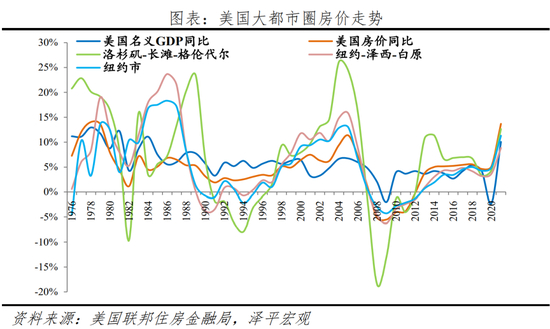 4)货币超发使得广义货币增速多高于名义GDP增长,刺激一线城市的房地产价格快速上涨。从国际看,1987-2022年2月英国房价年均增长6%,虽高于4.1%的名义GDP年均增速,但仍然低于7.1%的广义货币年均增速;1960-2021年美国房价年均增长4.5%,而名义GDP和M2年均增速分别为6.3%、7.2%。从大都市圈看,在美国,1975-2021年,纽约-泽西-白原分区房价年均增长5.8%,低于同期M2的6.9%,与GDP的5.8%相同。在日本,1975-1991年六个核心城市地价年均增长11.2%,其他城市地价年均增长6.4%,同期M2年均增长约9%。在中国,过去四十年广义货币供应量M2年均增速15%,1998年以来全国新建住房销售均价年均复合增速达7.72%,低于同期M2增速近8个百分点,而一线城市房价基本与M2增速持平。