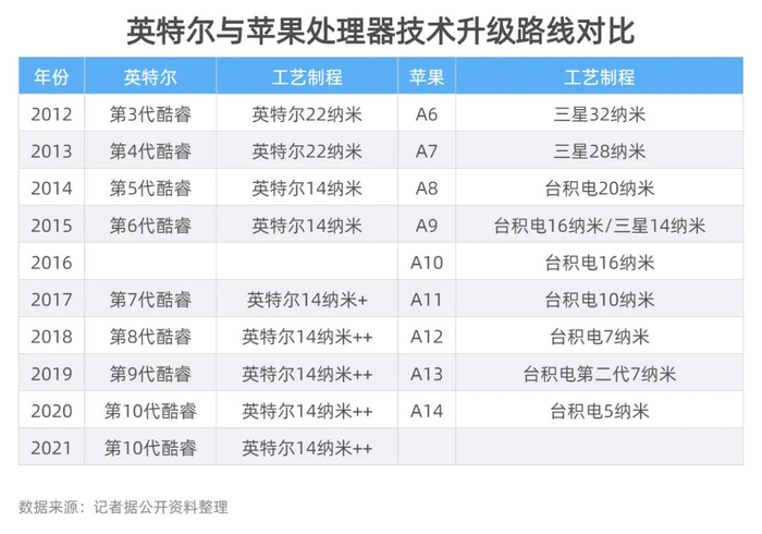 2012年~2020年,苹果A系列处理器制程水平持续升级,从32纳米一直升级到5纳米。而英特尔,本来应按照“Tick-Tock”[4] 钟摆模型的迭代策略,一年更新制程工艺,一年更新微处理器架构,即两年更新一次制程工艺。然而,英特尔2015年开始使用14纳米,直到2021年,还是使用14纳米及其衍生系列。