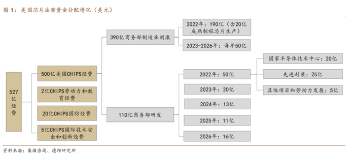 芯片法案包含两个核心内容:一是向半导体行业提供约527亿美元的资金支持,并为企业提供价值240亿美元的投资税抵免,鼓励企业在美国研发和制造芯片;二是在未来几年提供约2000亿美元的科研经费支持,重点支持人工智能、机器人技术、量子计算等前沿科技。